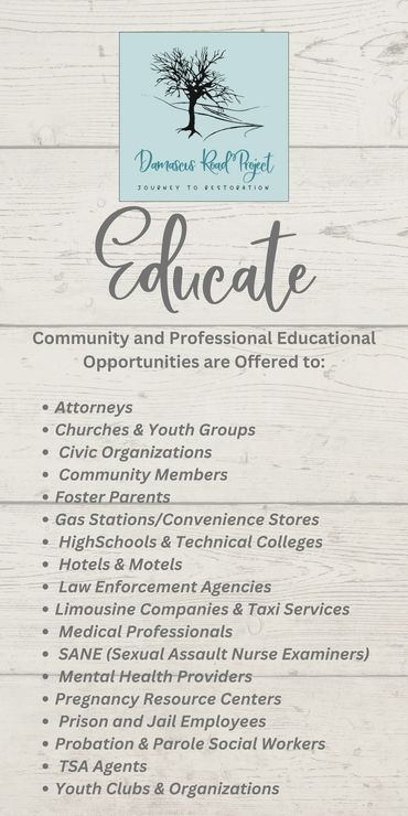 Damascus Road Project was founded in 2009 and is dedicated to fighting the evil of sex trafficking and sexual exploitation. We are committed to bring awareness through educating, restoring and empowering the abused, and advocating for the prevention and abolition of sex trafficking and commercial sexual exploitation.
